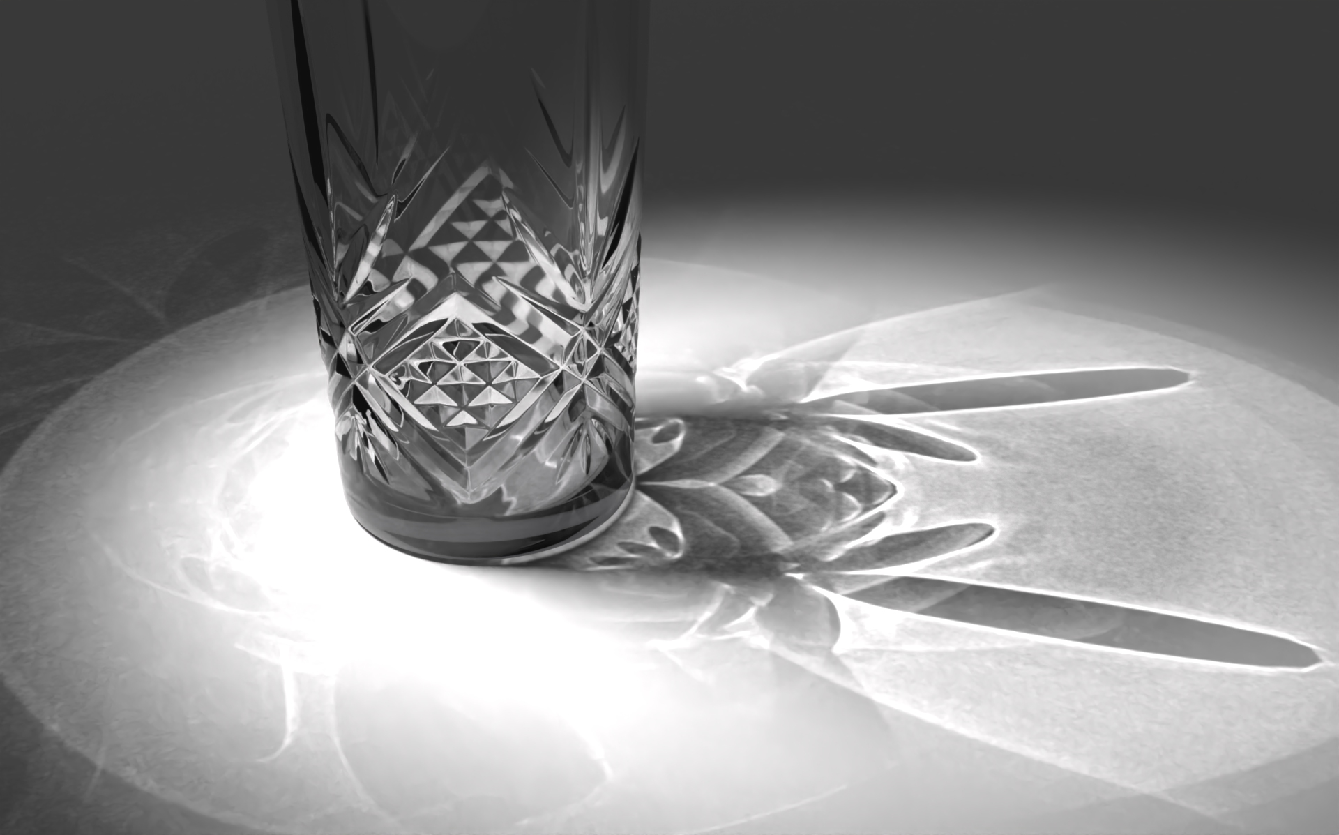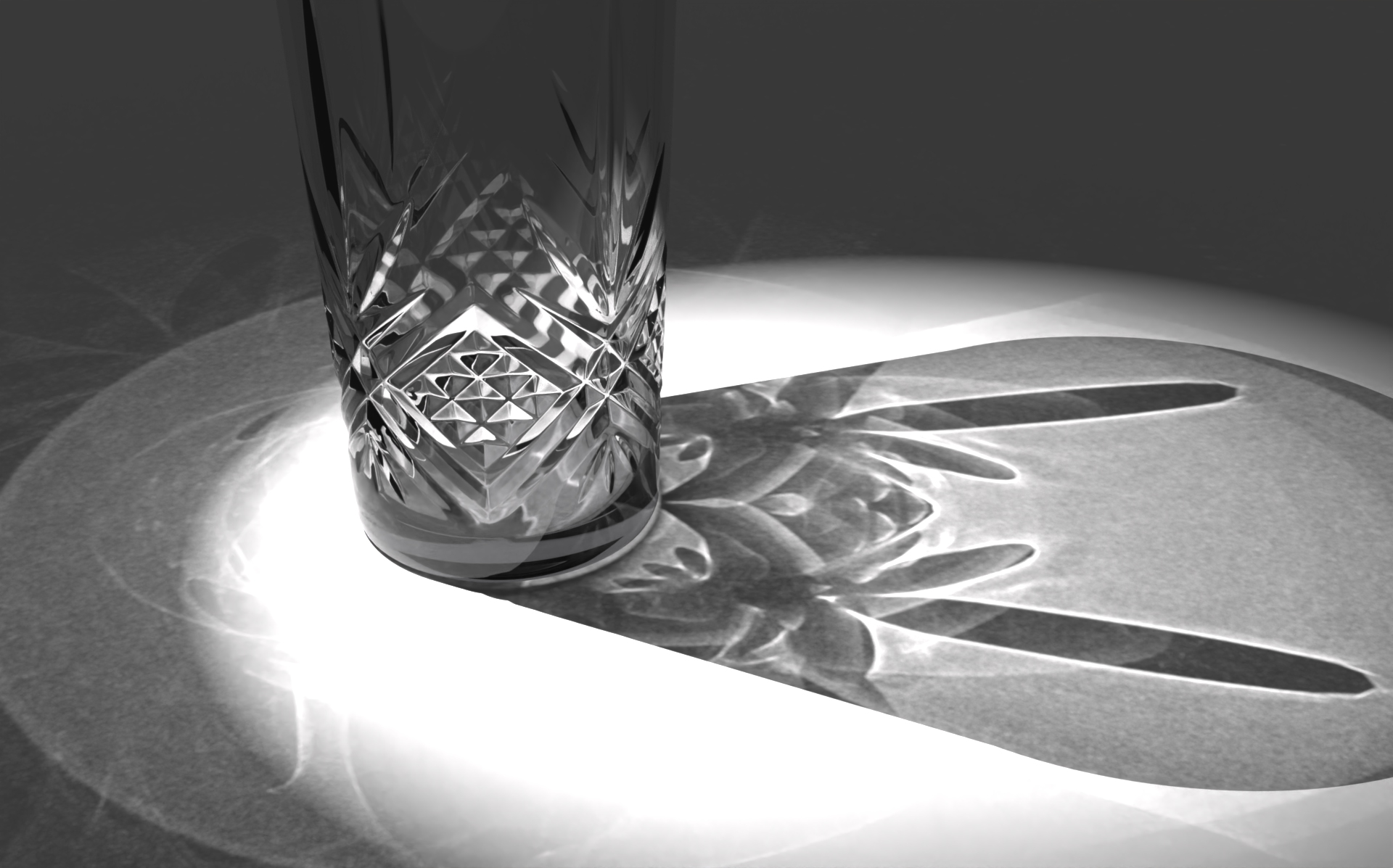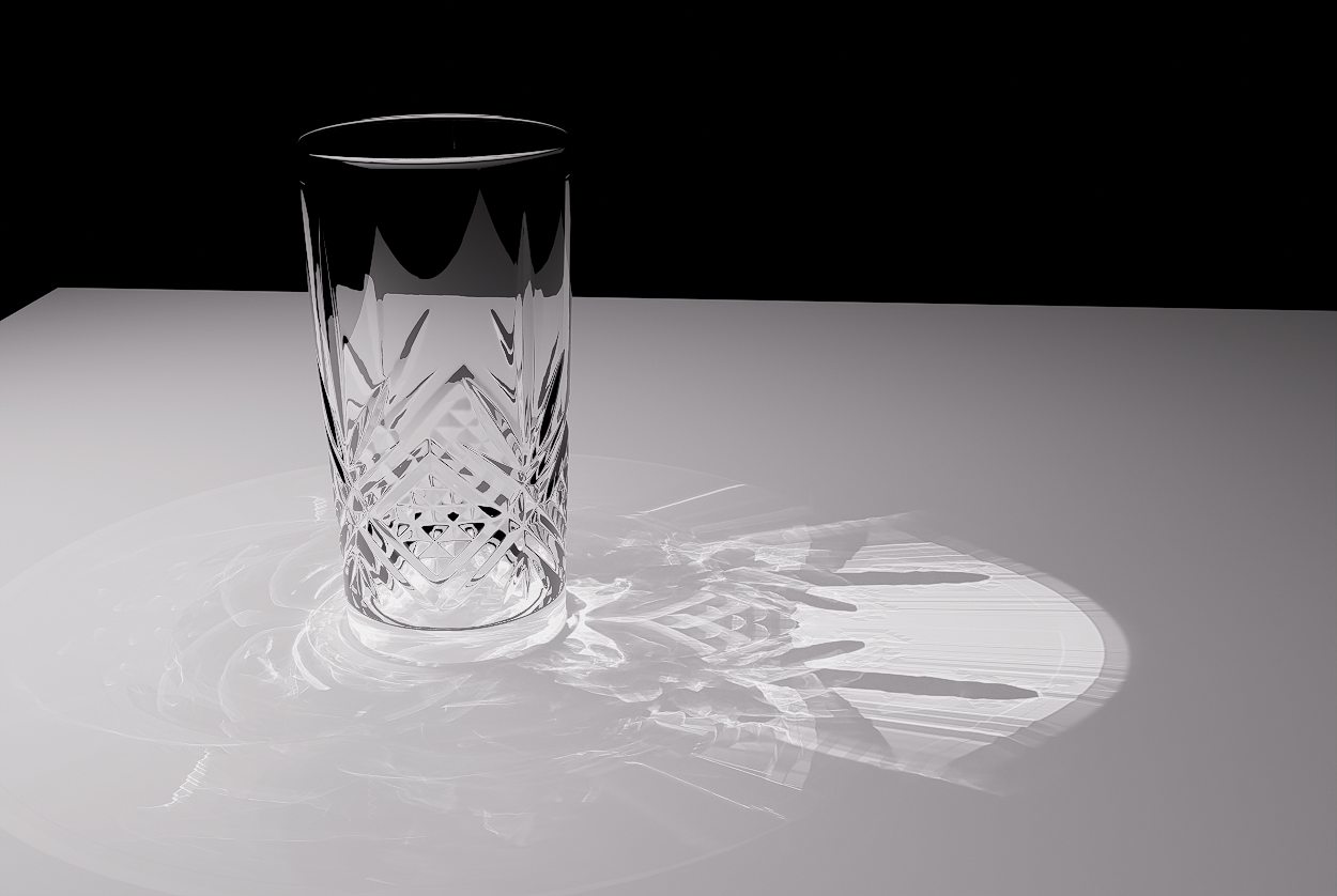 Con Keyshot, hay algo raro en estas cáusticas pues al ampliar el área de la luz, la sombra de área se difumina, pero las cáusticas siguen iguales, lo cual es incorrecto físicamente. Empaña la sospecha de ser una proyección.