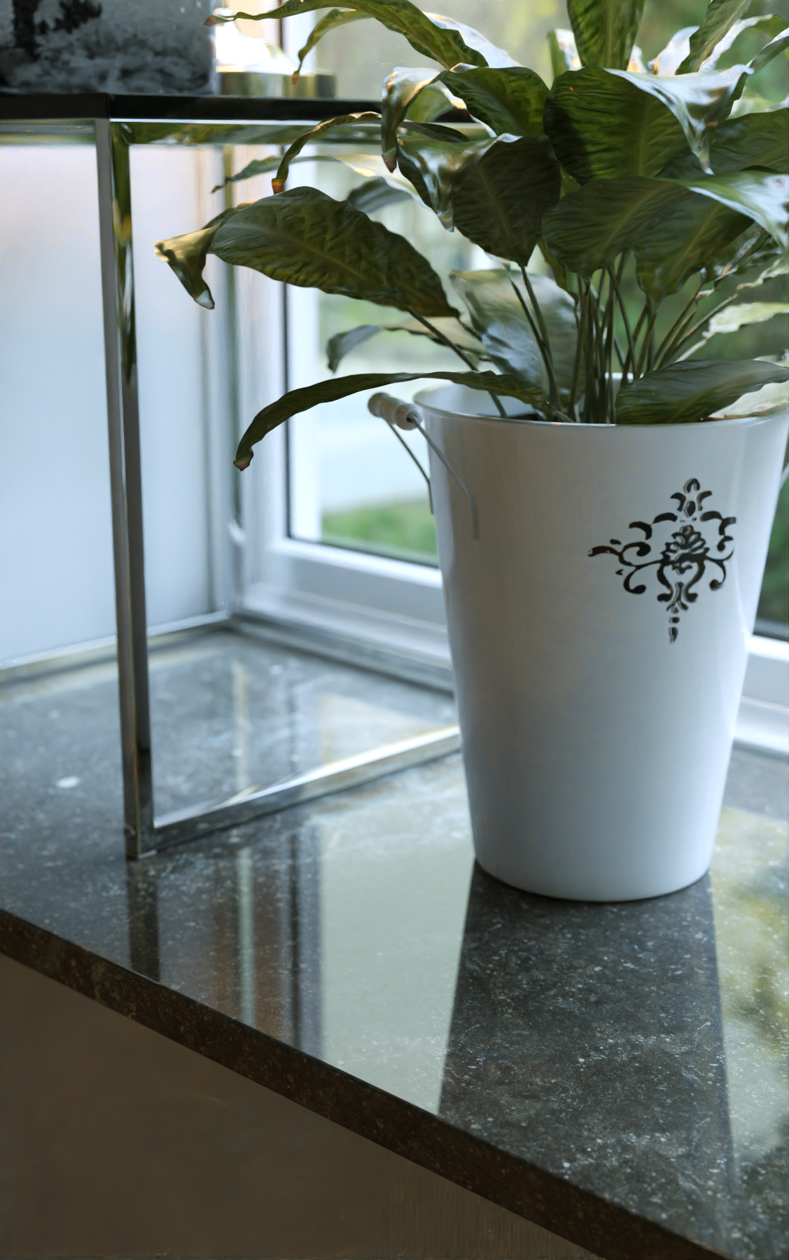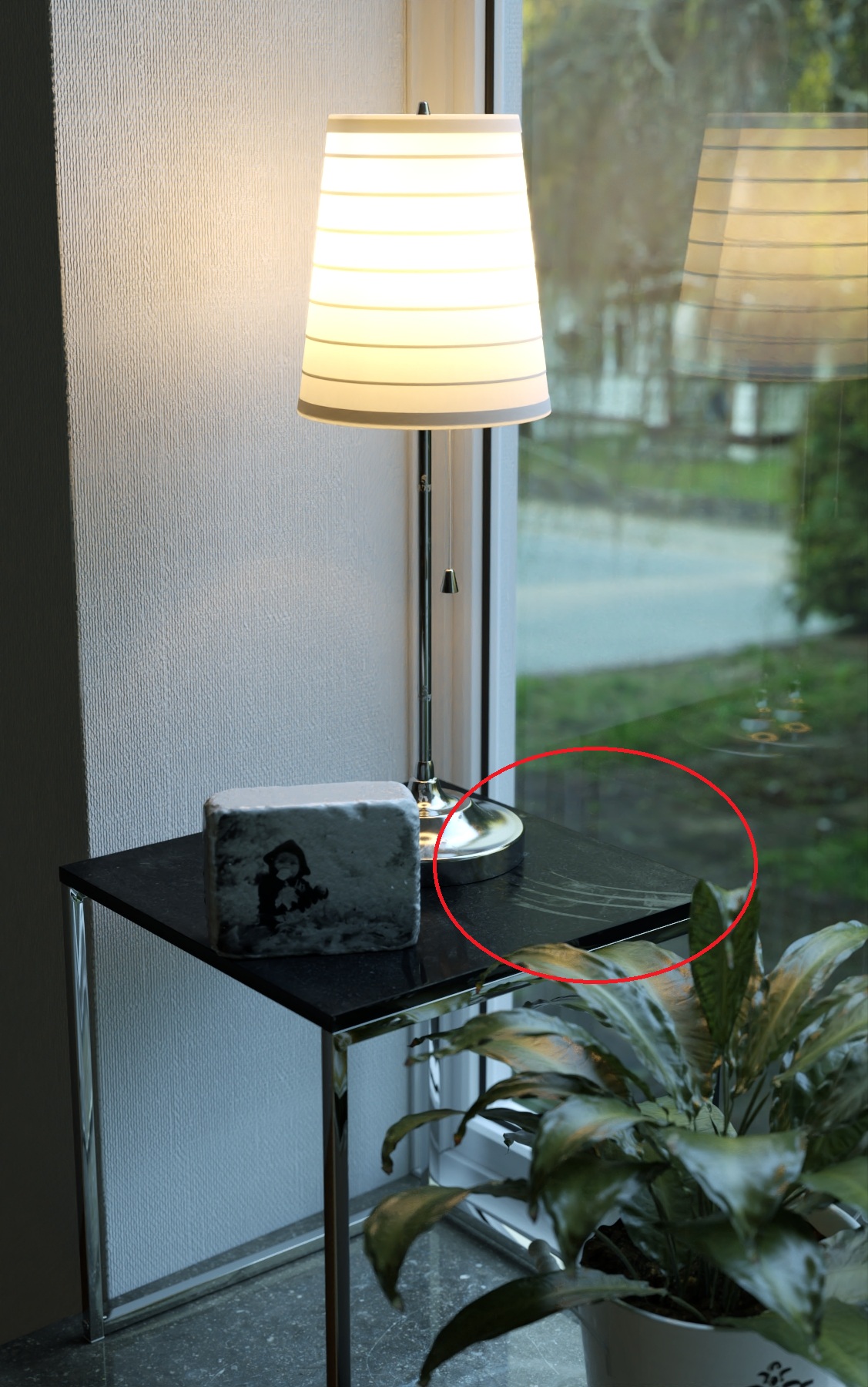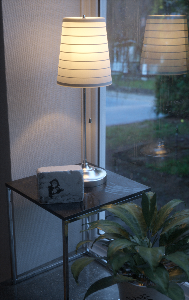 Aqui debajo, le bajé la influencia de la mascara del canal reflexión, se parece más aun a tu render, sobre todo si observamos la reflexión de la lámpara, tal parece que tu material de la mesa no tuviera la reflexión tan enmascarada.