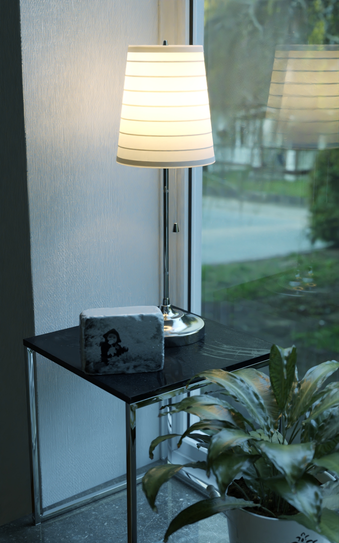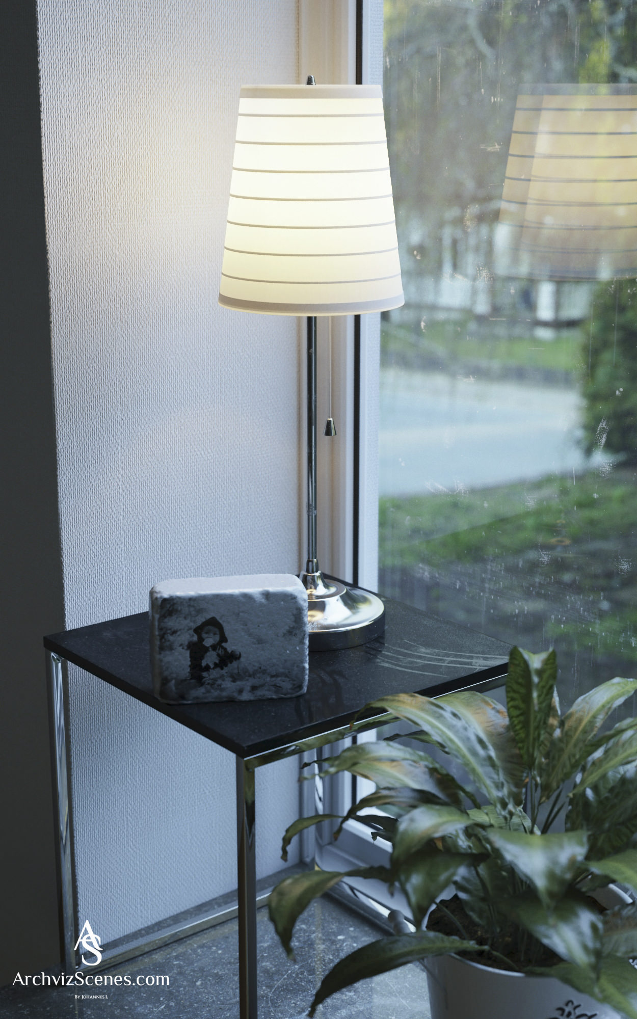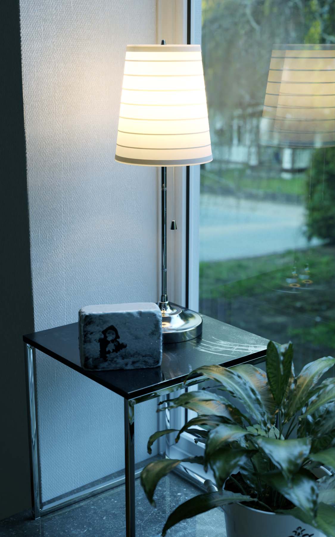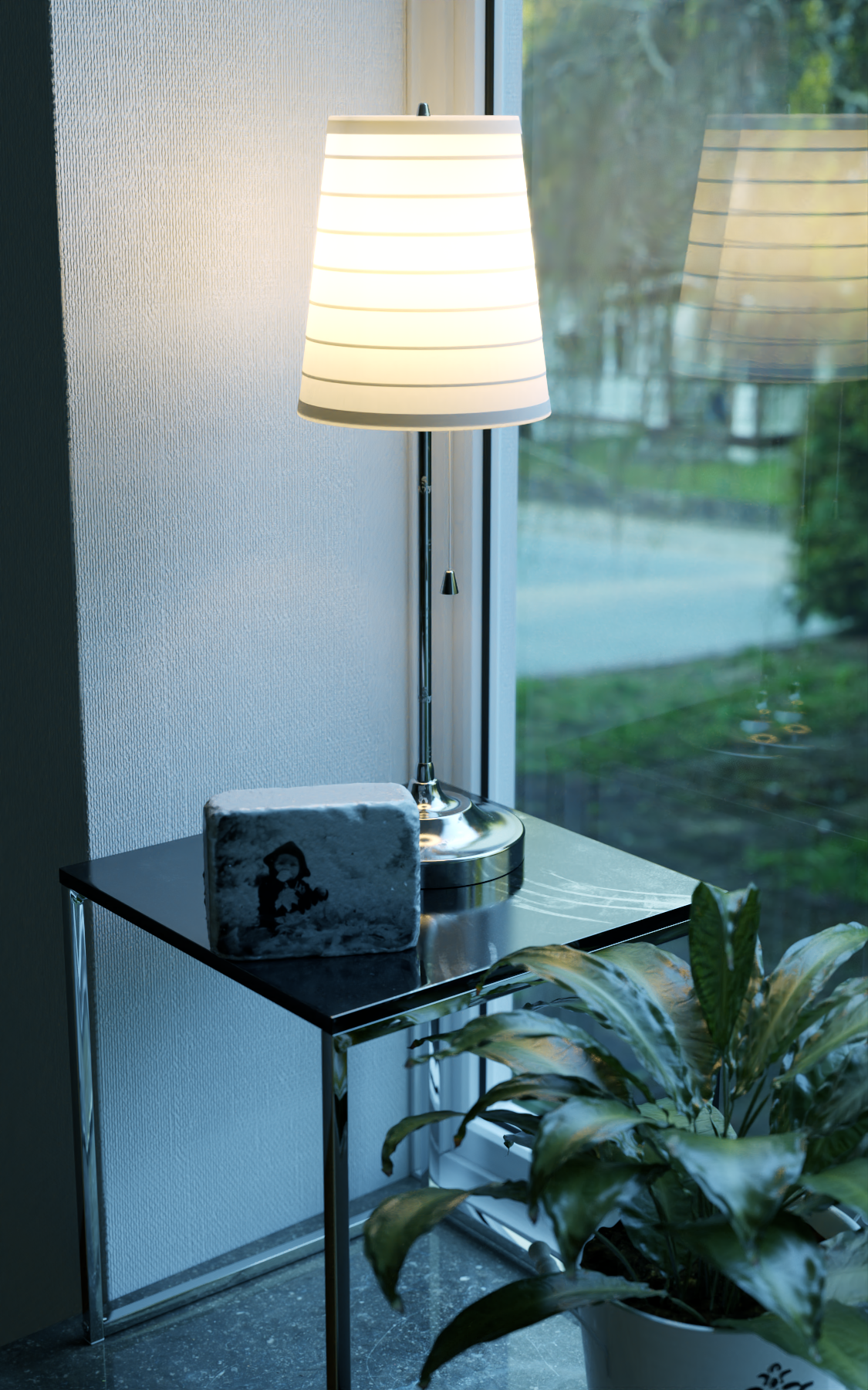 Y entre la HDRI, más ese material emisivo, ambas luminosidades no superan a la luz interior de la lámpara, es decir, que cuando la cámara apunta al exterior por la ventana, el control de exposición se abre aún más, pues afuera está más oscuro, y los marcos de las ventanas se incendian por dentro.