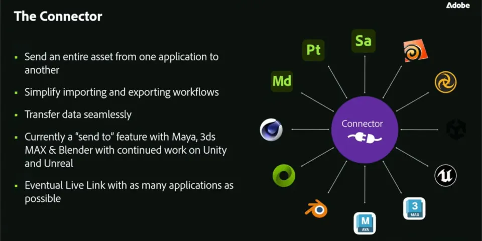 Adobe presenta Substance 3D Connector, una nueva arquitectura de complemento de código abierto que permite a los artistas enviar recursos directamente desde sus aplicaciones Substance 3D a software DCC como 3ds Max, Blender y Maya.