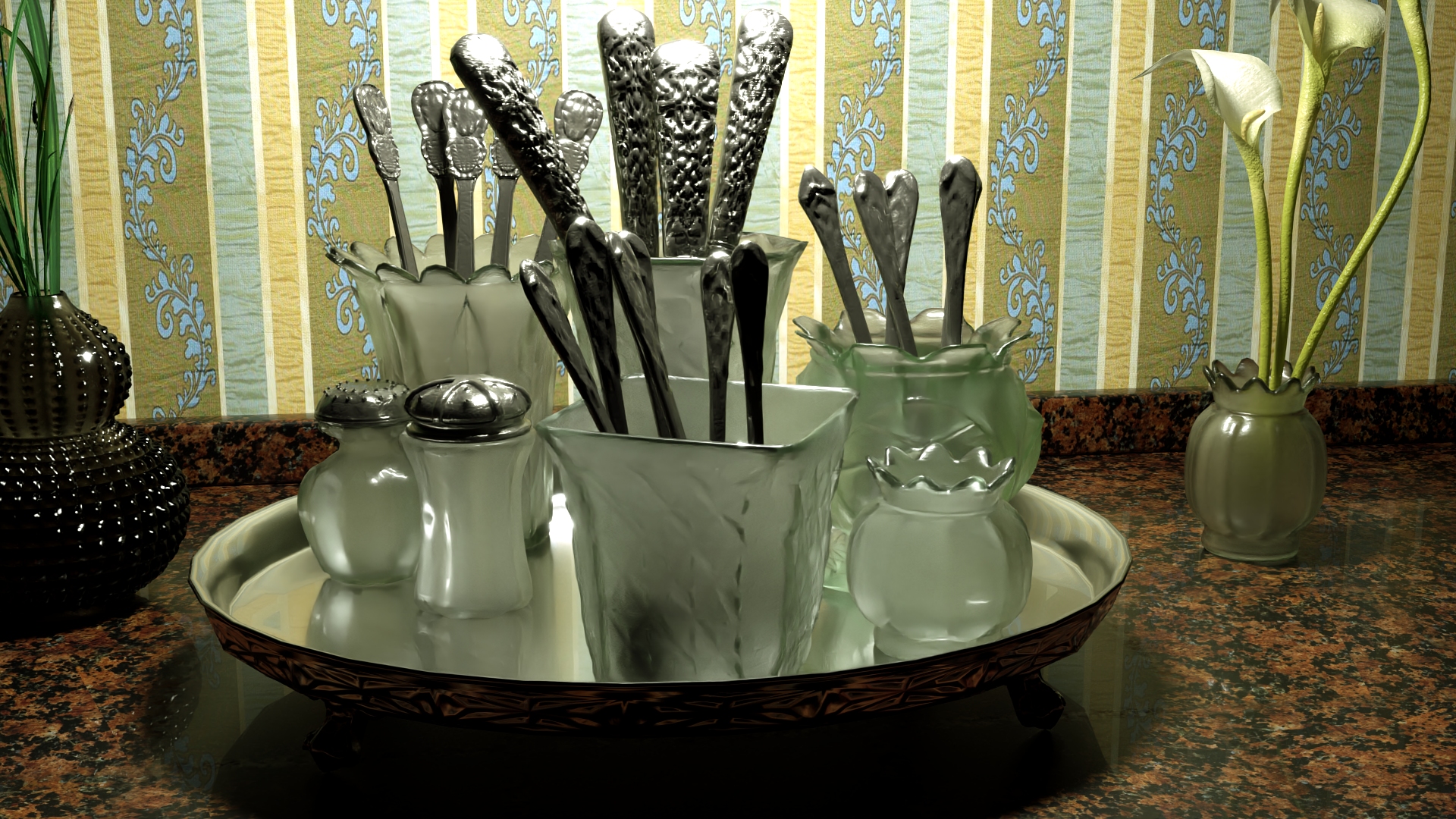 En este caso, he utilizado una máquina un poco mejor, una GT 1030 DDR4. Unas horas con los rebotes al máximo. En una RTX como la tuya, tardaría unos minutos, pero nunca llegaría a la velocidad del Vantage, que serían unos segundos, entiendo. Podrías hacer la prueba con una escena parecida y el Vantage. El cristal tipo Murano lo he conseguido con un mapa gradient. El metal tengo que mejorarlo, hacerlo más viejo.