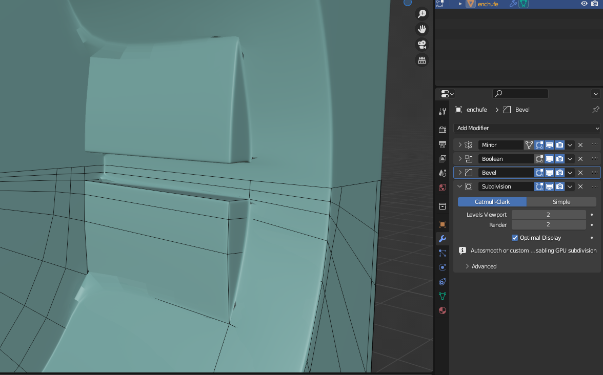 Estoy creando este enchufe, pero al aplicar el modificador Bevel y la Subdivisión, me genera muchos artefactos...