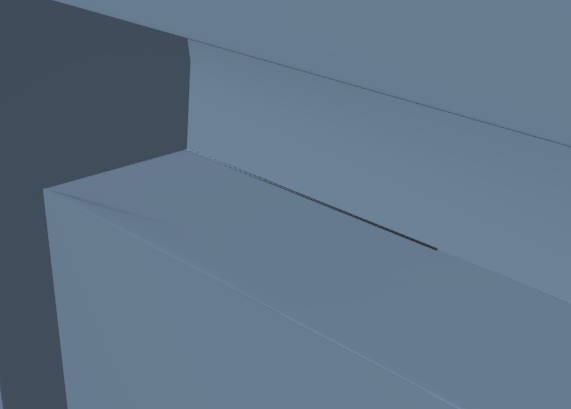 He rehecho el objeto para corregir algunas cosas y al hacer el split de la pared trasera, parece que estos defectos son menos evidentes. Aunque aún persiste alguno. Aquí, por ejemplo, se nota como un agujero y es solo una arista; no hay vértices duplicados ni caras con normales invertidas. Lo peor es que el efecto del bisel (bevel) no es aparente. Estoy intentando ajustar las opciones del modificador, como el ángulo, la cantidad (amount), la geometría interna y externa, pero no logro solucionarlo.