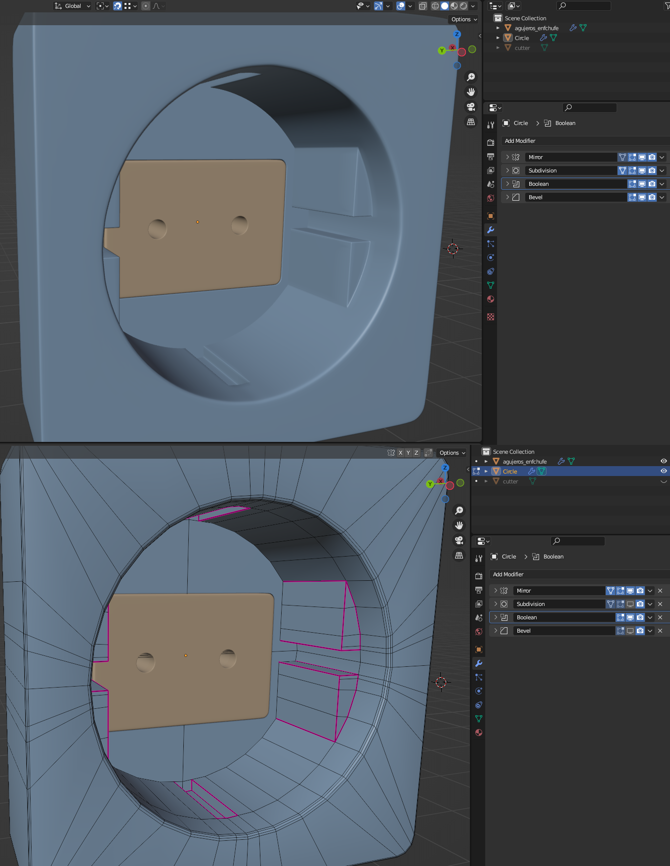 La parte separada al final la hice a propósito porque parecía que al hacerlo se eliminaban muchos de estos artefactos. Luego, una vez separada, procedí a extruir para realizar otro booleano de esa sección y olvidé eliminar las caras internas y demás... en fin, lo revisaré con más detalle para la próxima ocasión...