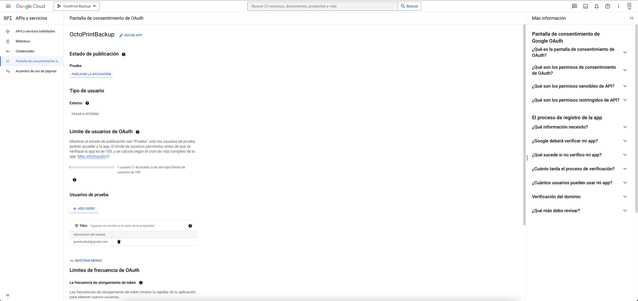 ¿Podría ser un problema debido a que la aplicación OAuth acaba de ser creada en mi panel de Google Developer y aún falta autorización por parte de Google? ¿Se os ocurre alguna otra idea?