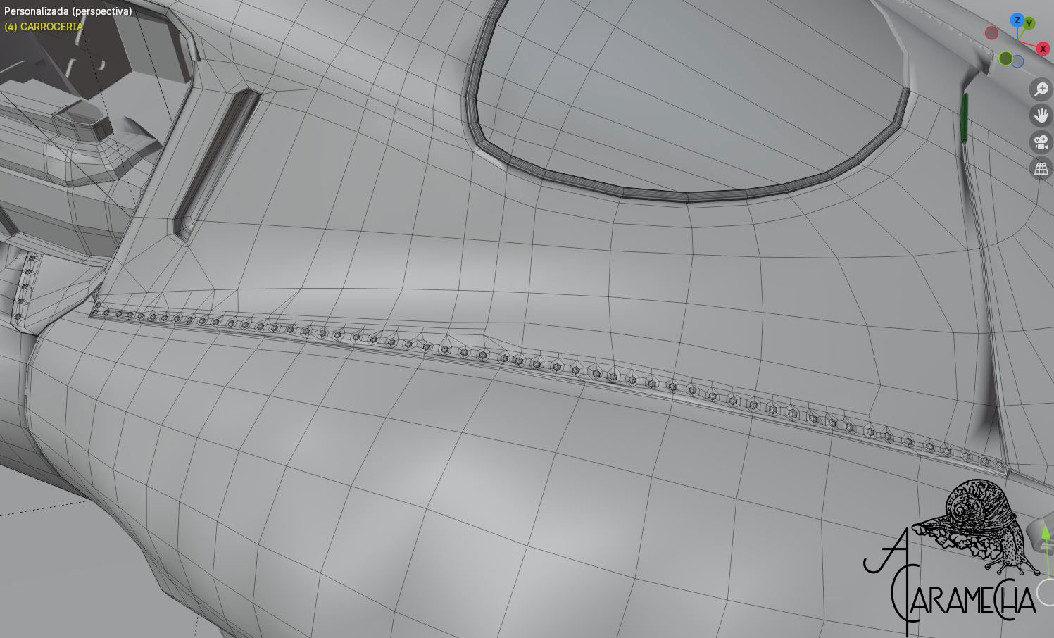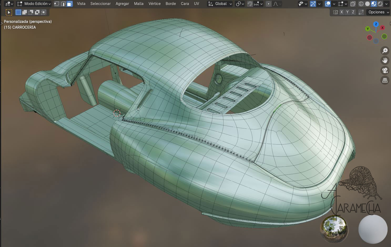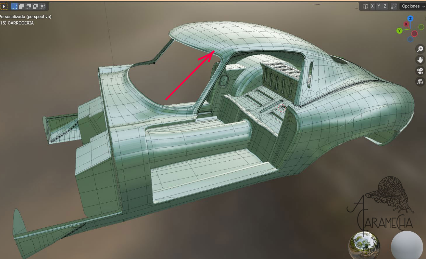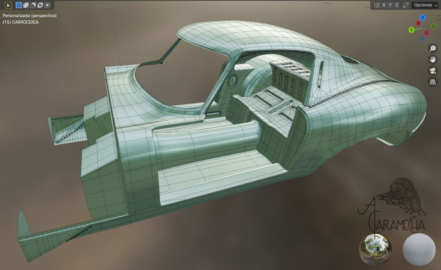 Esta es la malla que tenía en Max, la he importado en .obj. A partir de este punto, intentaré proseguir en Blender. Son capturas de pantalla, ya que empiezo de cero; no hay materiales ni luces... Empezamos.