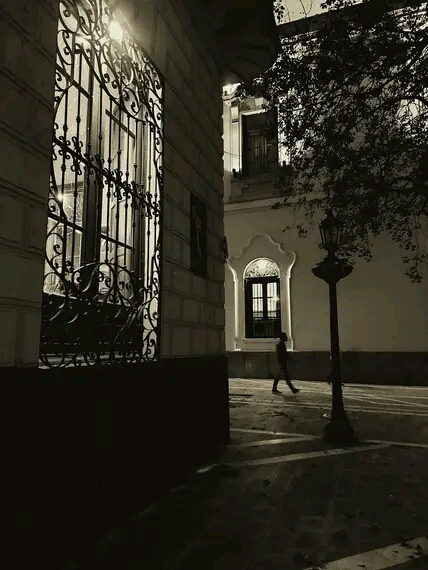 En efecto, la farola parece pequeña por el tamaño de las ventanas, pero la persona ayuda a identificar la escala. Yo evitaría un poco la quemazón de las paredes, resaltando la luz proveniente del interior de la ventana. Creo que obtendrías un ambiente más interesante, como se ve en la foto.