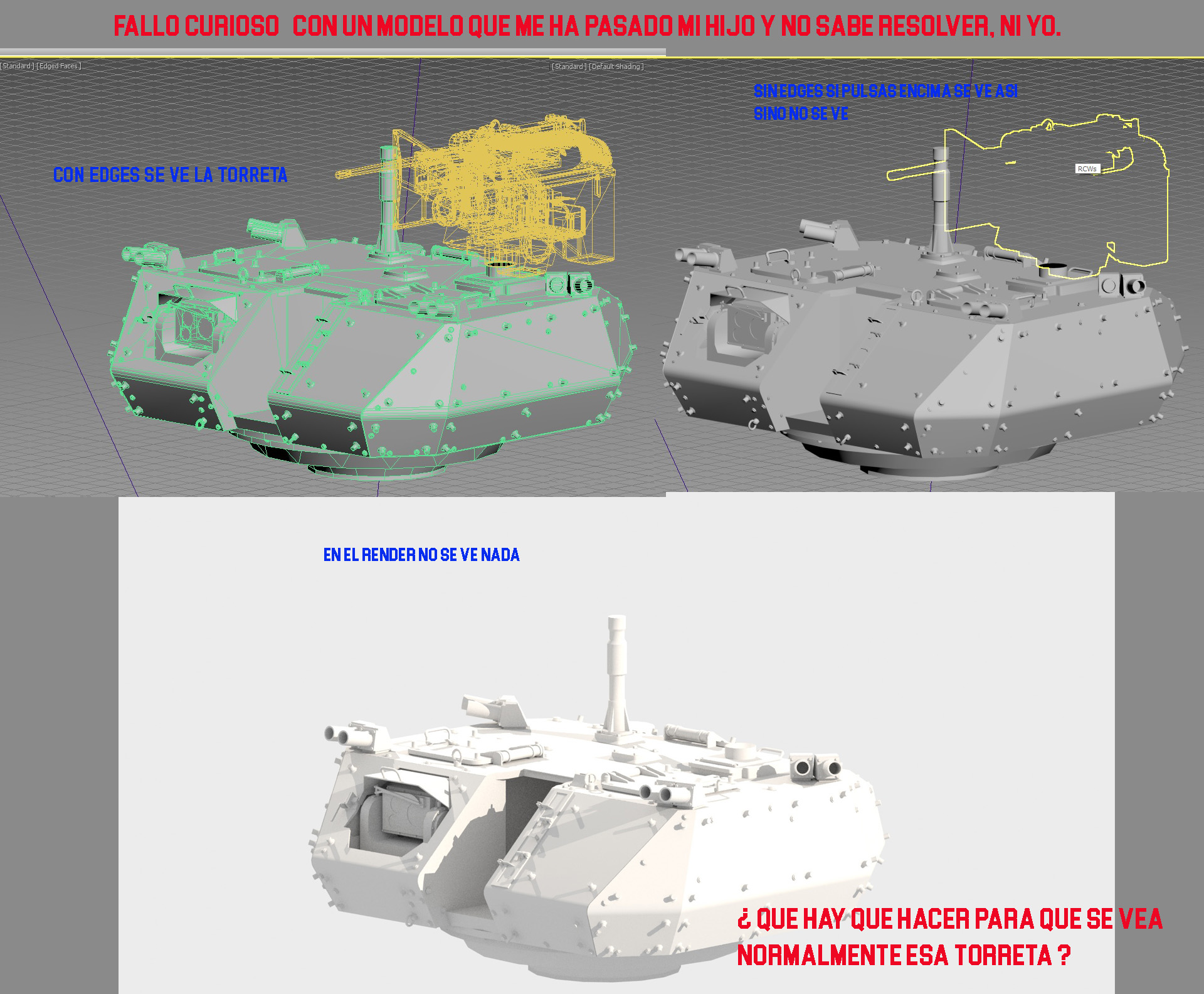 A ver si me podéis ayudar. Me ha pasado mi hijo un modelo de una torreta curiosa, tiene un elemento añadido que si no está en modo alambre o con edges no se ve, pero el Max te lo perfila como diciendo que ahí está, pero que al renderizar no sale.