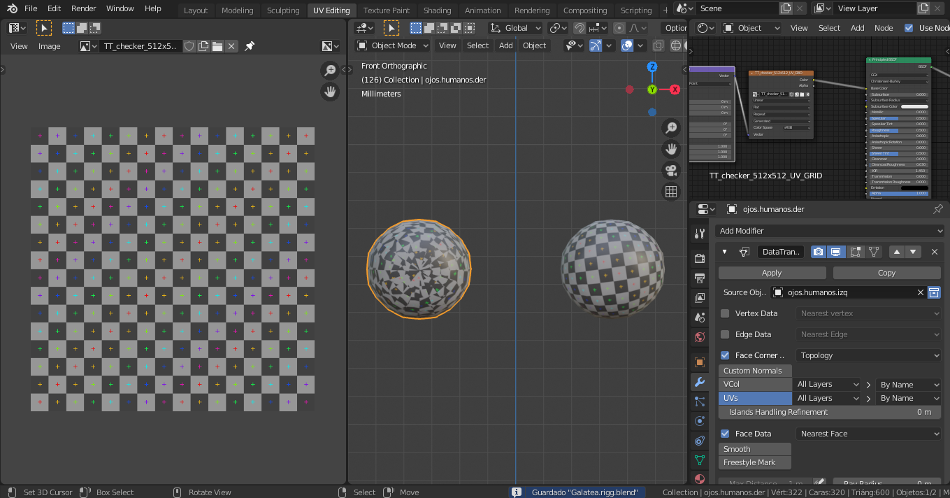 Estoy teniendo problemas al querer copiar el mapa UV de un objeto a otro idéntico -en este caso son 2 ojos-. El problema es que copia exactamente la dispocisión de las caras; pero la posición de las mismas quedan todas desordenadas.