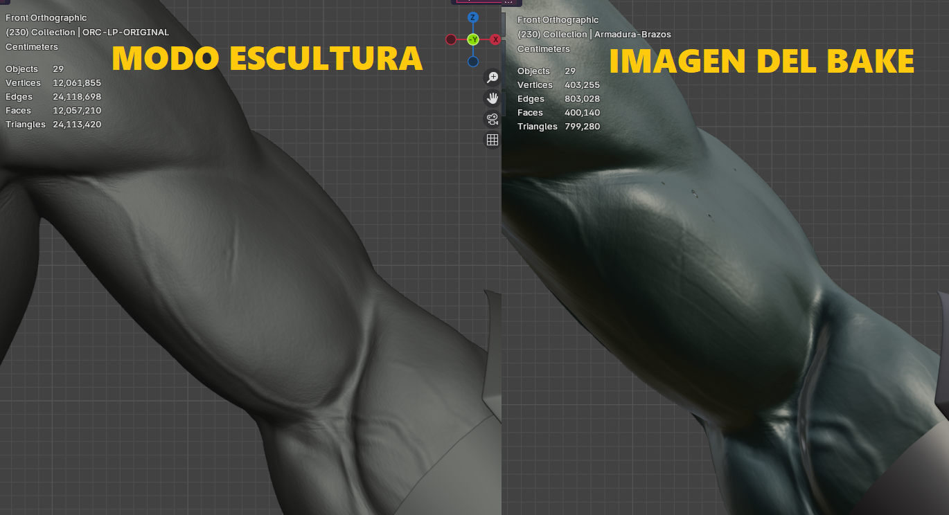 Lado izquierdo, el modelo en el modo escultura con multi-res rango 5 (así debería verse luego del bake)