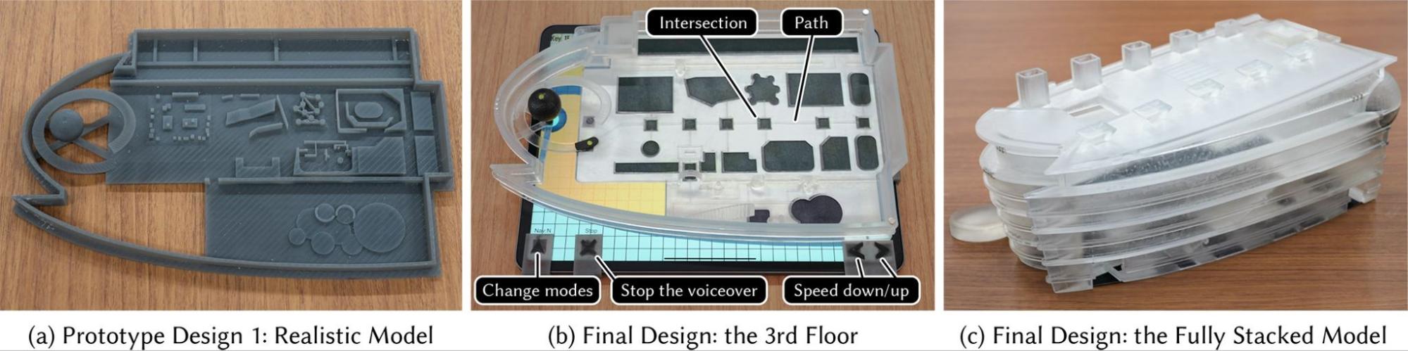 BentoMuseum ofrece una solución diferente: un modelo 3D apilable que se parece a una caja bento. Cada capa de este modelo tiene texturas que permiten a las personas tocar y entender el diseño del museo. Al colocar cada capa sobre una tablet, el modelo proporciona información a través de sonidos que se activan con el tacto, lo que ayuda a las personas a aprender sobre el museo antes de visitarlo.