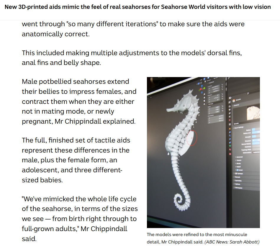 Les quiero contar una historia increíble sobre cómo la impresión 3D está haciendo el mundo más accesible. En Tasmania, un acuario llamado Seahorse World utiliza modelos 3D de caballitos de mar para que las personas con baja visión puedan disfrutar de las exhibiciones de una manera diferente. Lo que antes solo podían ver, ahora también lo sienten con las manos.