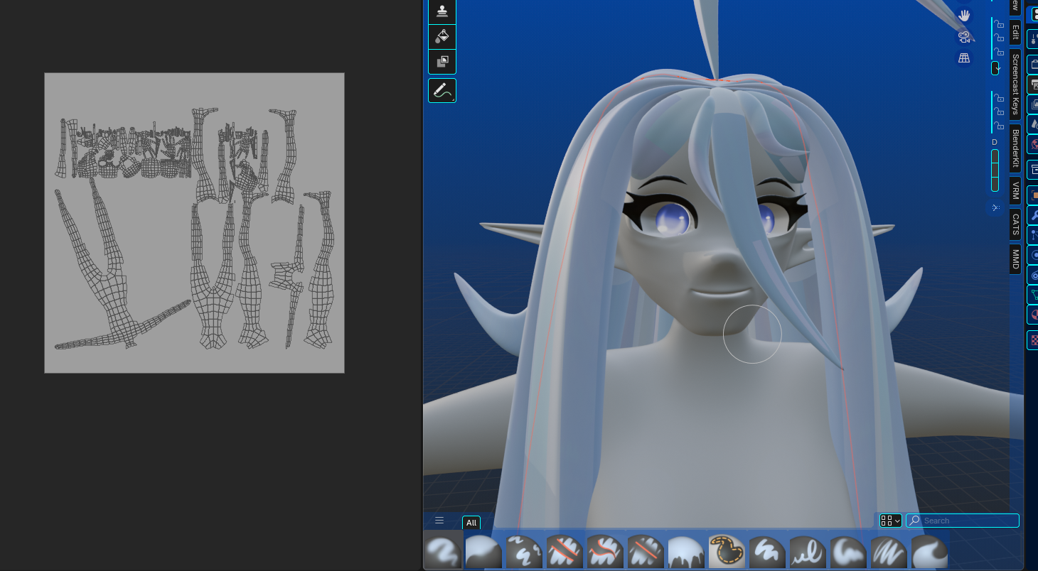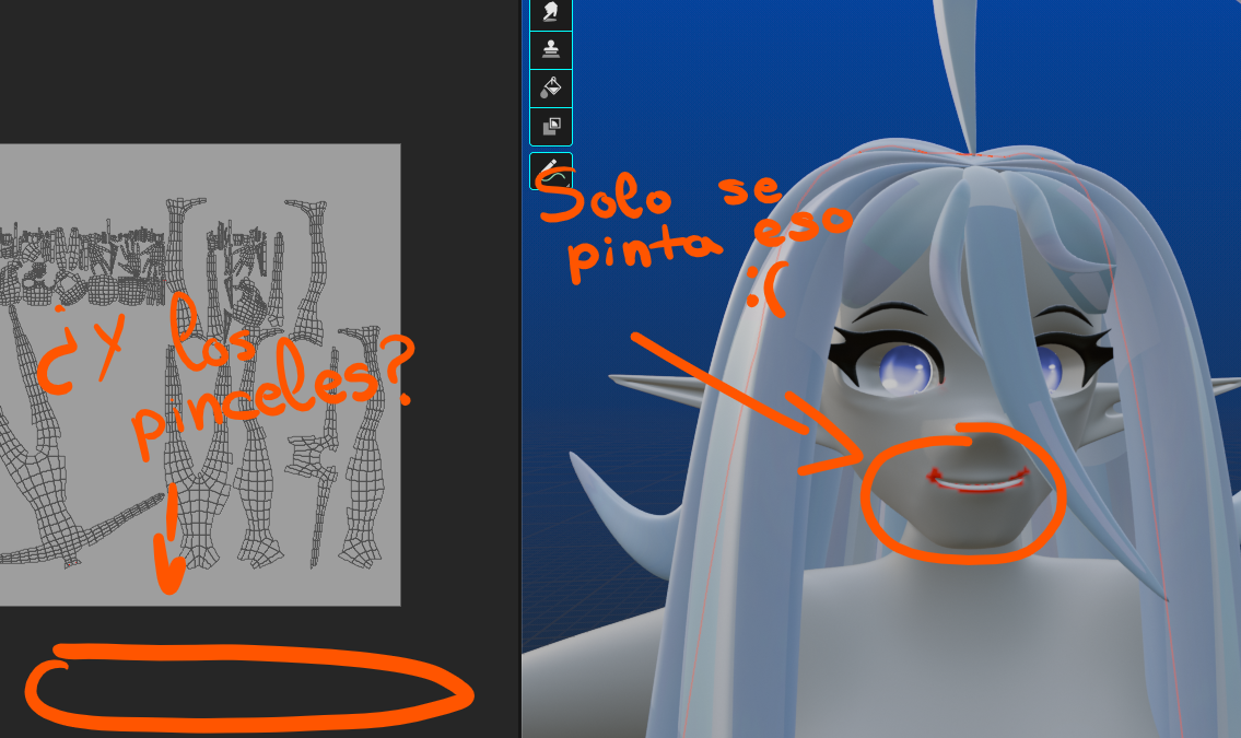 Hola, no sé si se pregunta por aquí, soy nueva. Pero estoy teniendo problemas para pintar mi modelo: no me deja pintar en el mapa UV y solo me permite pintar en una parte del modelo. Adjunto aquí las imágenes: