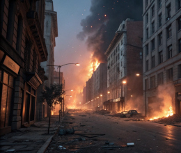Junto con el fuego, los entornos urbanos también fueron recreados digitalmente. Algunos edificios se escanearon en 3D con fotogrametría y se reconstruyeron en Maya y Clarisse para su destrucción progresiva. Se agregaron detalles como cristales rotos, ventanas en llamas y capas de hollín y suciedad en superficies que, en realidad, nunca estuvieron allí. Todo se iluminó con Arnold Render y se integró en composición con Nuke, equilibrando cada plano para no romper la ilusión.