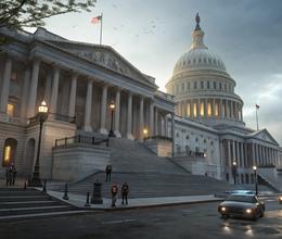 RVX tomó filmaciones en exteriores de un juzgado en Nueva York para convertirlas en los escalones y columnas del Capitolio. Con herramientas de composición y digital matte painting, ajustaron las proporciones del pórtico, texturizaron superficies de concreto para que parecieran mármol y corrigieron la iluminación para simular luz natural proyectada en Capitolio real.