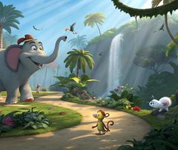La imagen de Horton y sus amigos presenta una escena colorida y detallada de la Jungla de Nool. Los elementos clave incluyen: