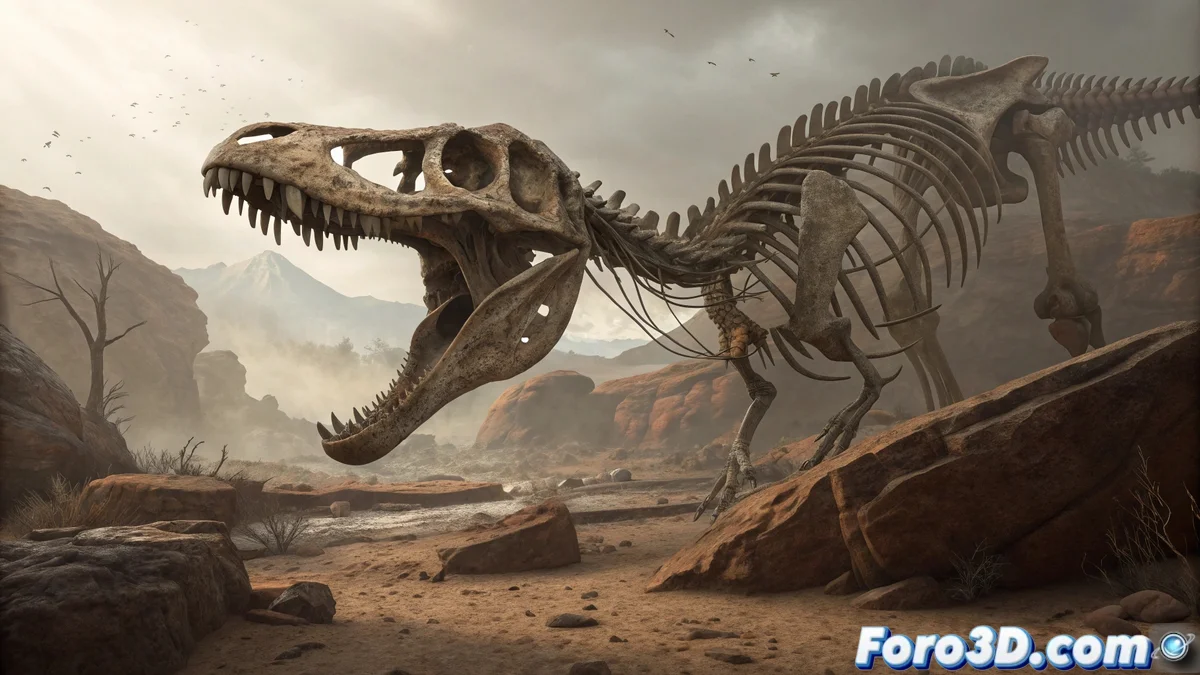 - Añade luces secundarias para resaltar texturas y profundidad de los huesos fosilizados.