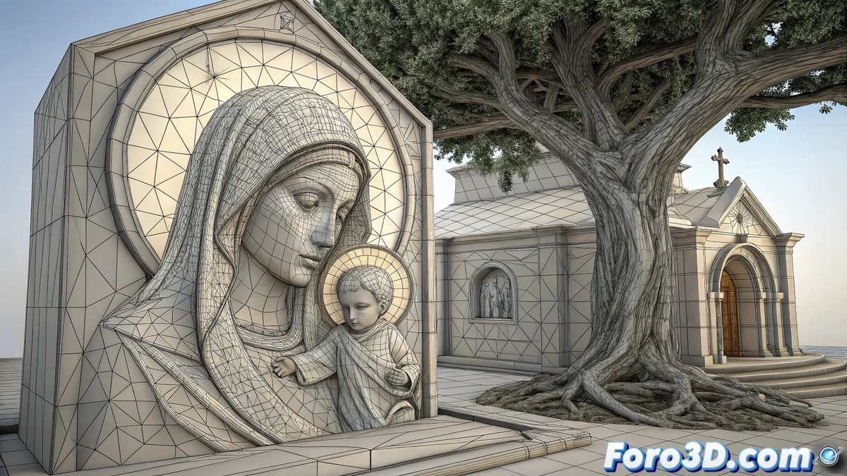 Blender permite recrear este relieve con gran fidelidad. Usando sculpting se puede esculpir la figura de la Virgen y el Niño con todos sus pliegues y expresiones, mientras que el halo en forma de árbol se diseña aplicando geometría detallada con ramas y raíces. Con Cycles se logra una iluminación realista que simula la luz que entra en la capilla, resaltando volúmenes y texturas. Además, el uso de bake maps ayuda a optimizar el modelo para renders más ligeros sin perder detalle en el relieve.