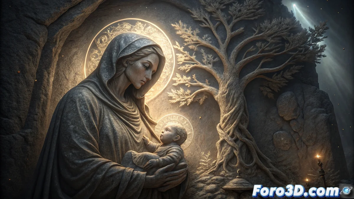- Exporta la imagen final destacando el relieve de la Virgen con el Niño y el árbol de la vida, en un entorno histórico y evocador.