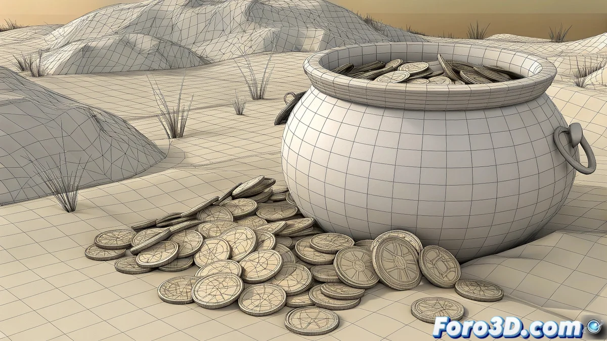 Blender permite recrear este hallazgo con gran realismo. Con high-poly modeling se pueden diseñar monedas y cofres con detalles finos, mientras que sculpting ayuda a reproducir texturas de desgaste y relieve en las piezas. Cycles facilita un render realista con reflejos metálicos y sombras precisas, mostrando la riqueza del tesoro. Además, particle systems permiten simular pequeñas monedas dispersas en la arena, creando una composición dinámica y atractiva.