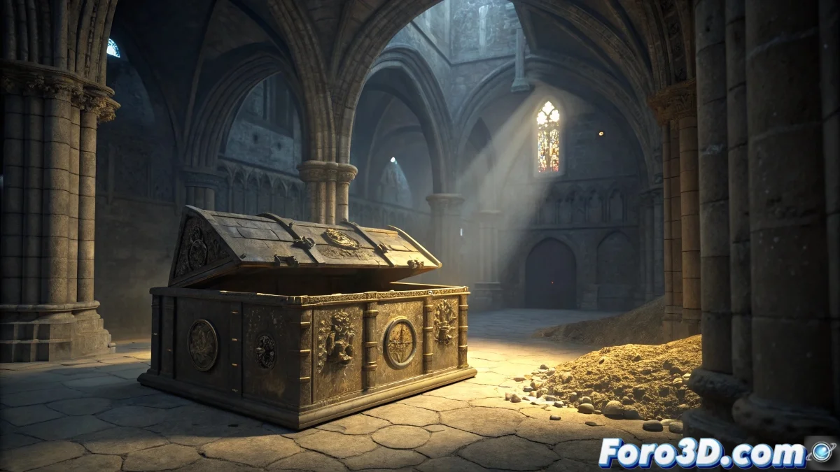 - Coloca el cofre sobre un suelo de piedra del claustro y añade columnas o arcos de fondo para contextualizar la escena.