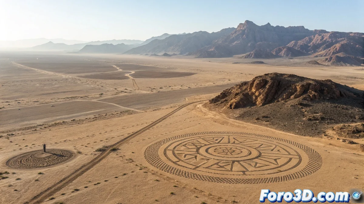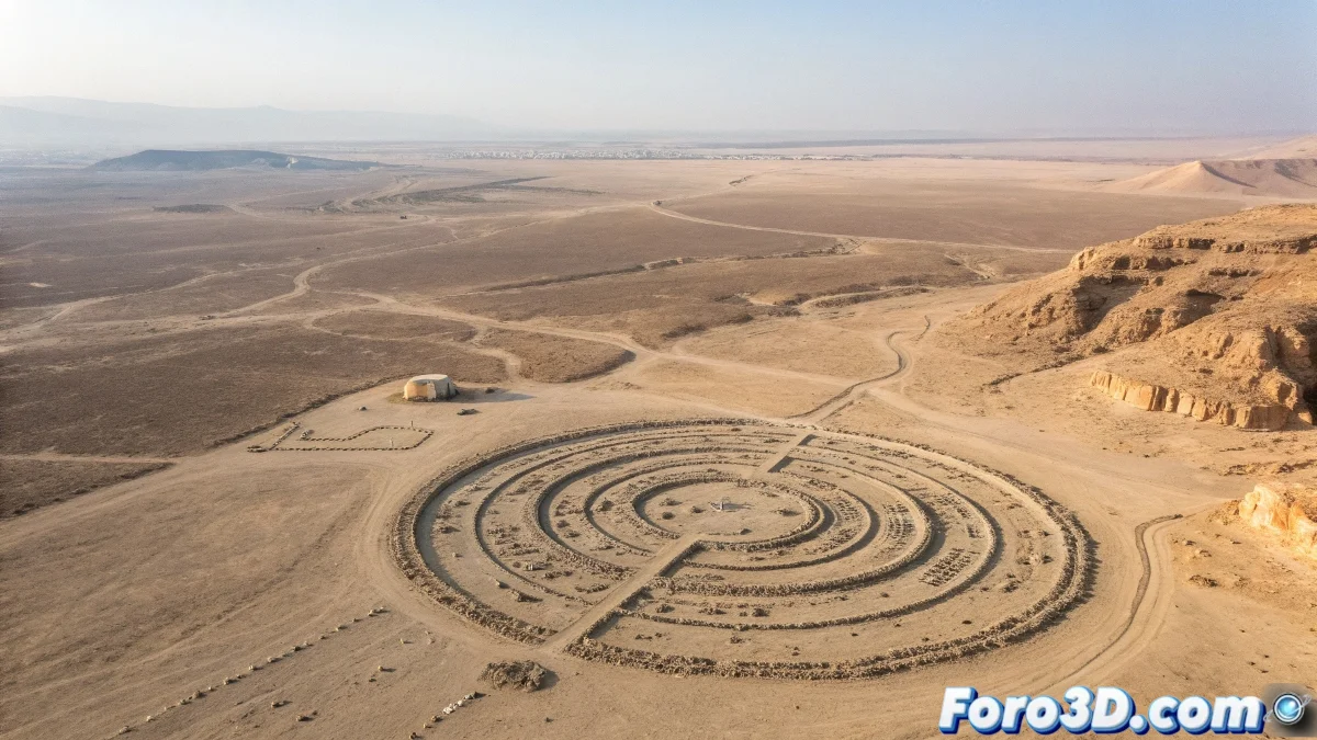 - Genera el render final mostrando la “Rueda de Medio Oriente” desde el aire y en contexto con el desierto, resaltando su carácter enigmático y simbólico.