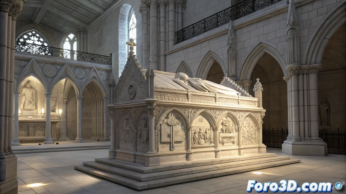 En Blender, la tumba puede modelarse con alta fidelidad arquitectónica y escultórica, incluyendo detalles de relieves y elementos góticos. La iluminación volumétrica y de área permite recrear la luz que atraviesa las vidrieras del presbiterio, destacando el sepulcro en el contexto del altar mayor. Con texturas PBR y shaders realistas, se puede simular la piedra tallada y el desgaste del tiempo, mientras que la composición y cámara animada permite explorar la tumba desde distintos ángulos, resaltando su significado histórico y simbólico.