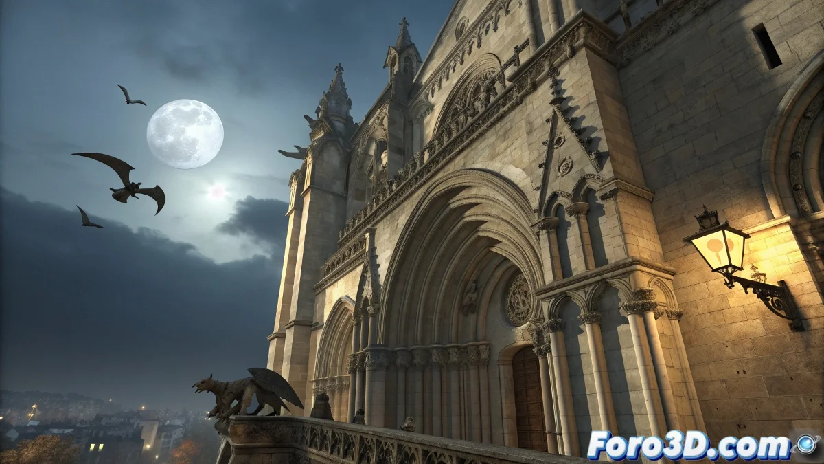 - Usa luz direccional para resaltar sombras y detalles de las gárgolas.