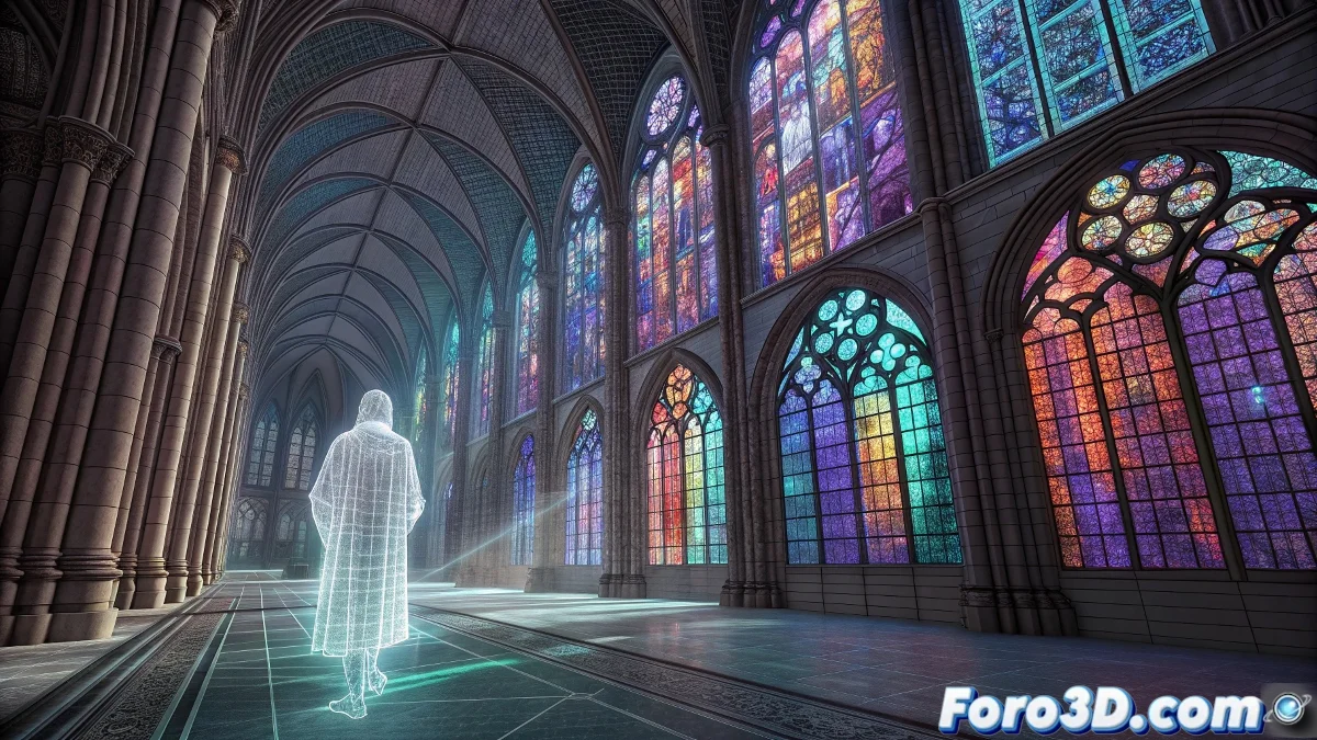Las cámaras animadas permiten recorrer el interior mostrando tanto el efecto del fantasma como la majestuosidad del espacio sagrado, acentuando los detalles de los vitrales y la arquitectura gótica.