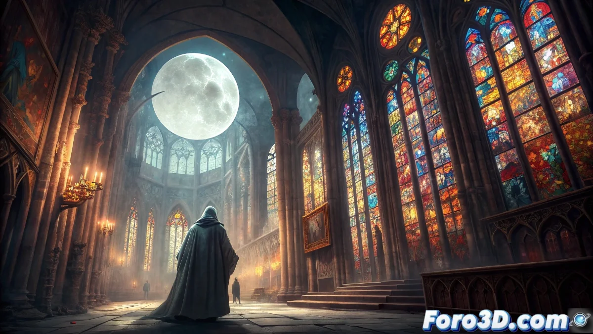 En Maya, esta escena puede recrearse modelando el interior gótico de la catedral con precisión arquitectónica, incluyendo las vidrieras de colores y los juegos de luz que atraviesan los vitrales. El fantasma del monje puede animarse con efectos de transparencia, partículas ligeras y sutiles deformaciones para simular su eterealidad, mientras las luces volumétricas y las sombras proyectadas crean una atmósfera misteriosa.