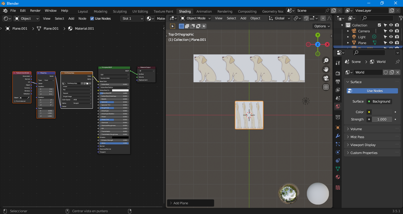 Al aplicar este material, la textura se repetirá 4 veces horizontalmente (por ScaleX=4), sin deformarse, y solo será visible en la mitad superior del plano gracias al ajuste de Location Y y al mapeado UV de esa sección.