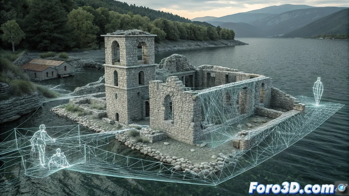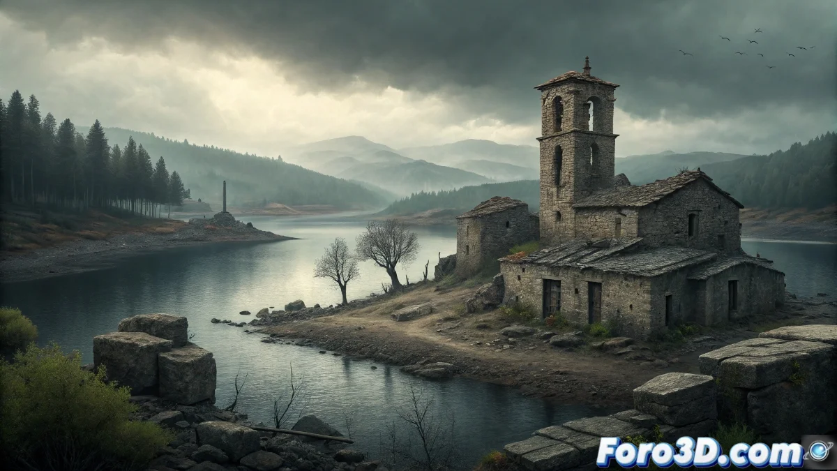 Un modelo 3D detallado de Ribadelago Viejo, mostrando el entorno inundado y los fantasmas de la catástrofe, listo para visualización o composición audiovisual.