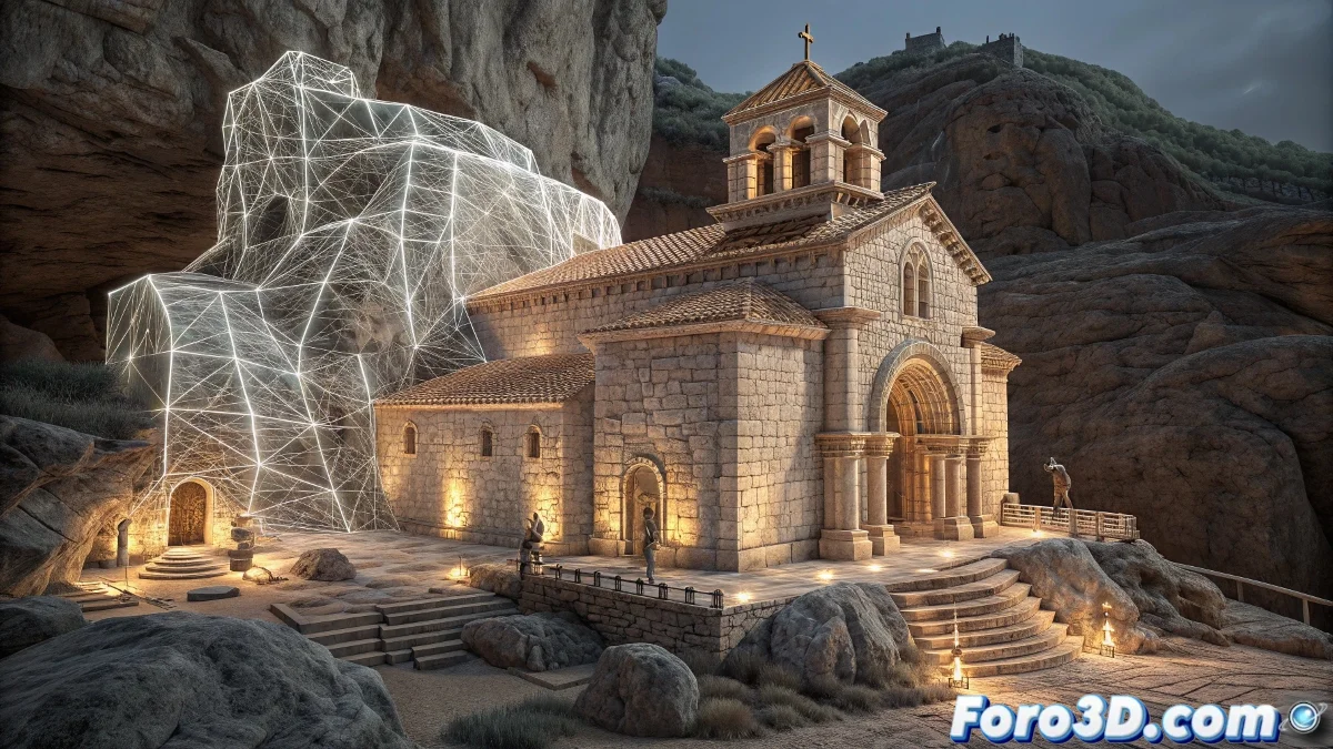 Modelado 3D de la iglesia rupestre incluyendo capillas, criptas y detalles de la roca.