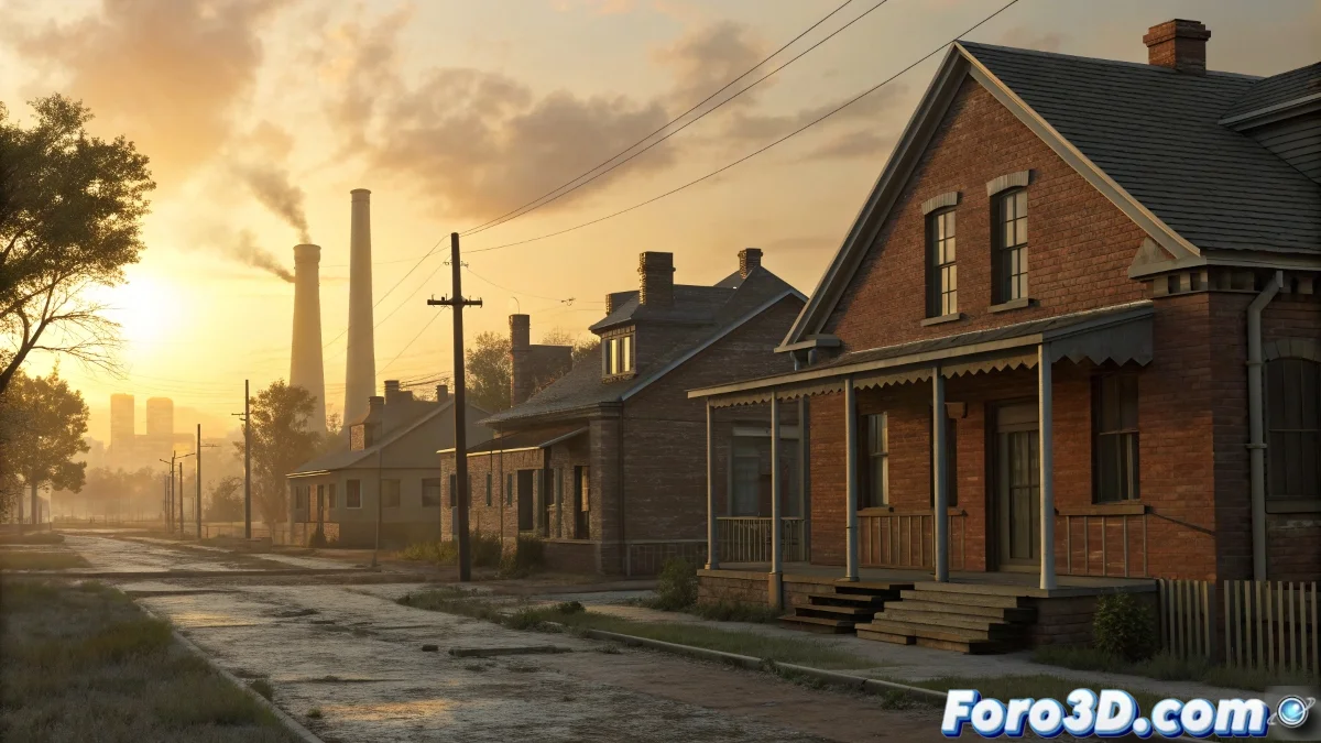Modelado 3D del pueblo y sus construcciones con detalle arquitectónico de finales del siglo XIX.