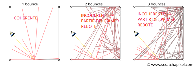Rayos secundarios (incoherentes): Los rayos que rebotan después de chocar con una superficie (para calcular reflejos, refracciones e iluminación indirecta) se dispersan en direcciones aleatorias o casi aleatorias. Por ejemplo, en una superficie difusa, el rayo puede rebotar en cualquier dirección dentro del hemisferio. Esta aleatoriedad hace que los rayos posteriores sigan caminos muy diferentes, se dirijan a distintas partes de la escena y accedan a datos no contiguos en la memoria.