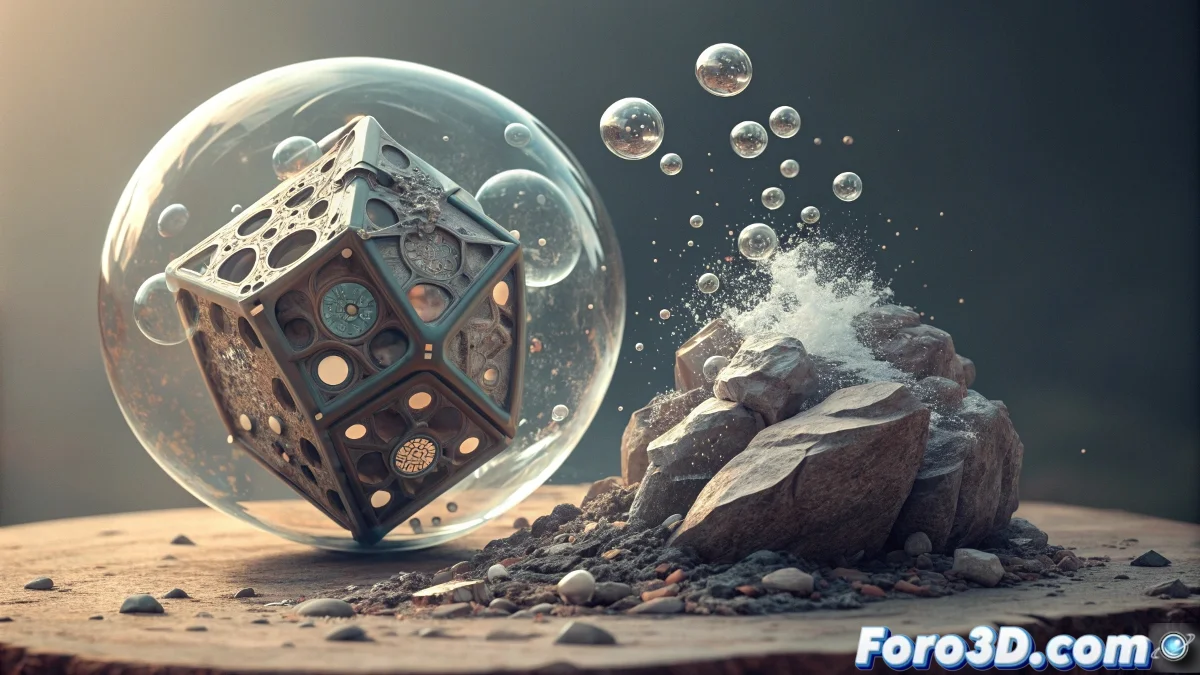 Meshroom utiliza algoritmos de IA avanzados para convertir imágenes simples en modelos 3D detallados, demostrando el valor práctico de la inteligencia artificial más allá de la especulación. Para visualizar el concepto de burbuja versus tecnología sólida, podemos crear una escena que muestre objetos reales transformándose en representaciones digitales precisas.