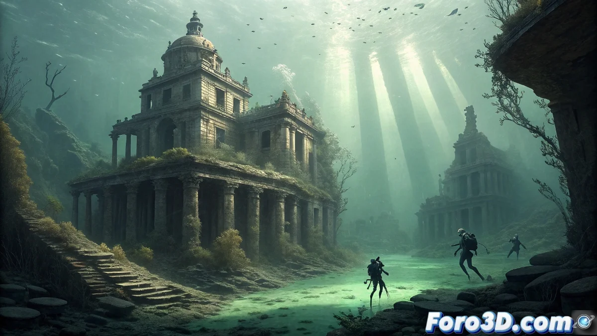 Aplicamos un volumen de niebla con scattering de luz para crear el efecto de visibilidad reducida bajo el agua, animando su densidad con un noise de tiempo lento. Añadimos rayos de luz solar que penetran la superficie usando beams volumétricos, controlando su dispersión con un shader / compute de fase anisotrópica. Para el render final, utilizamos un tonemapping de contraste suave y añadimos partículas de burbujas cerca de las estructuras usando un POP network con fuerzas de flotabilidad.