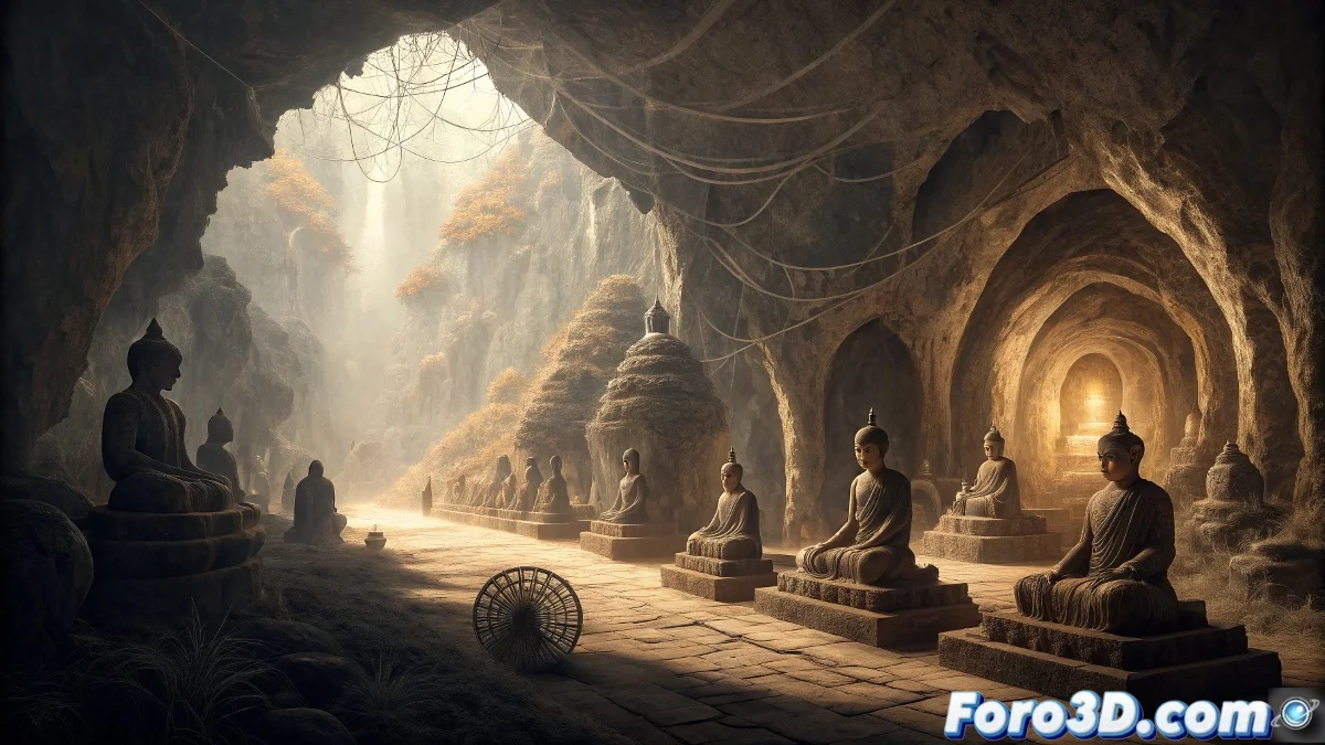 Empleamos el sistema de colocación múltiple para distribuir las ocho mil estatuas de Buda, variando sus tamaños y orientaciones en pasillos y nichos para lograr naturalidad. Aplicamos materiales de piedra erosionada y dorados desgastados que reflejen el paso del tiempo, mientras añadimos efectos de neblina volumétrica y polvo en suspensión para intensificar el misterio. Incluimos arañas de tamaño normal en rincones oscuros como guiño a la leyenda, usando iluminación puntual estratégica para sugerir presencia sin mostrarla explícitamente.