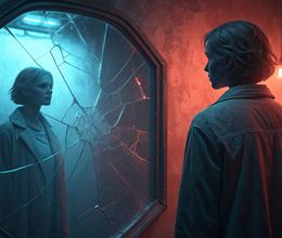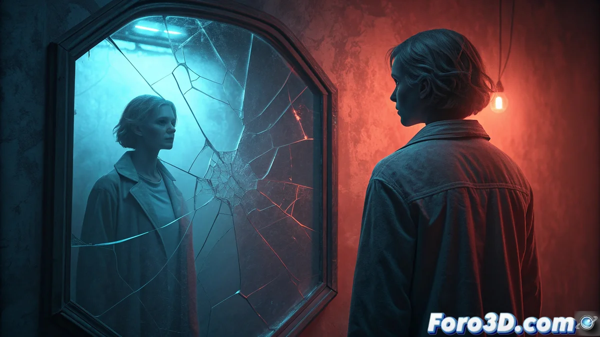 Desde un punto de vista técnico, la construcción de las escenas podría imaginarse con iluminación dual, una fuente fría y otra cálida, para acentuar la dicotomía del yo y su copia. En un entorno 3D, esta estética podría lograrse con motores como Unreal Engine o Blender, empleando materiales reflectantes y efectos de postprocesado para distorsionar el entorno, simulando una mente fragmentada.