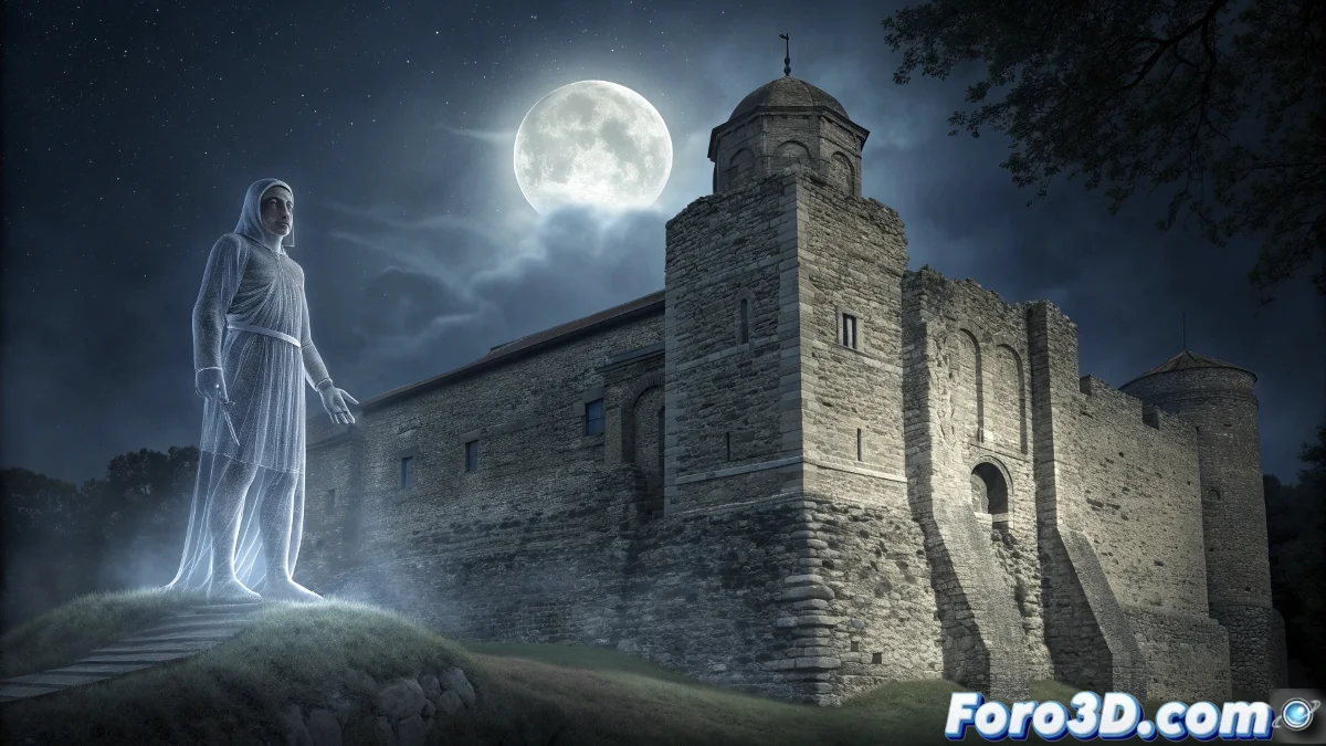 Aplicamos un sistema de subdivisiones suaves para lograr las formas redondeadas típicas de la arquitectura normanda, prestando especial atención a las almenas superiores donde aparece el fantasma. Configuramos una iluminación ambiental tenue con tonos azulados y grisáceos que simulen la atmósfera nocturna inglesa.