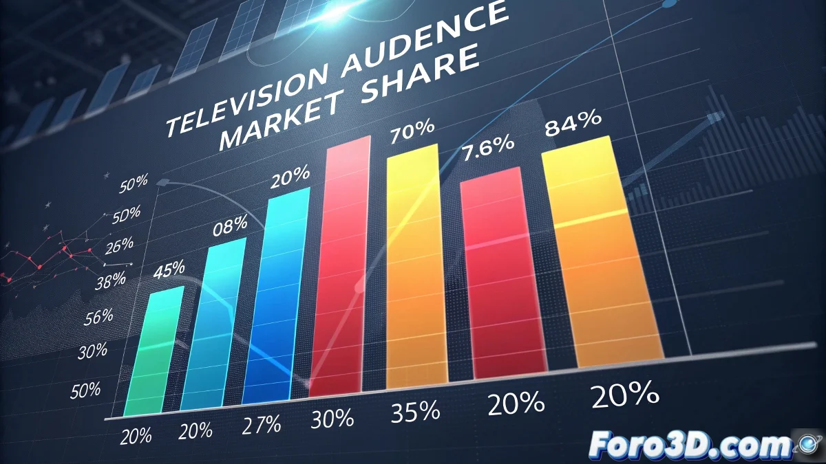 Utiliza la herramienta de selección rectangular para crear la base del gráfico de barras. Dibuja rectángulos proporcionales a los porcentajes de audiencia utilizando diferentes colores para cada barra. Emplea la herramienta de degradado para añadir profundidad visual a las barras, aplicando sombreado desde tonos oscuros en la base hacia colores más claros en la parte superior. Añade etiquetas descriptivas usando texto en capas separadas, aplicando efectos de sombra paralela para mejorar legibilidad.