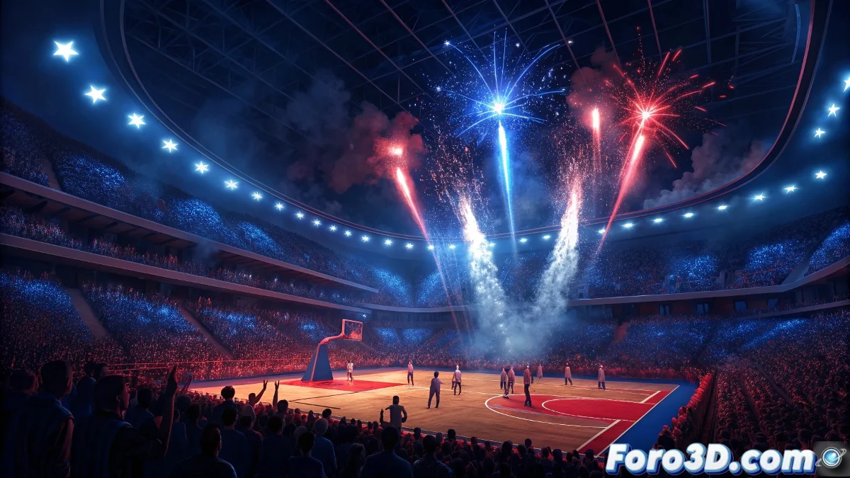 Configura un sistema de iluminación basado en HDRI para simular el ambiente nocturno del estadio. Añade luces puntuales estratégicas que iluminen las caras de los celebrantes y creen reflejos en la cancha. Desarrolla materiales PBR para las diferentes superficies: madera pulida para la cancha, textiles para la ropa de los aficionados y metales para las estructuras del estadio. Implementa shaders emissivos para las pantallas de marcador que muestren el resultado final 100-85.