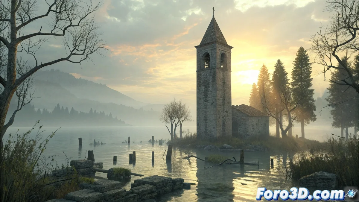 Aplica gradientes de color para simular la iluminación de amanecer con niebla. Crea un gradiente vertical desde azul oscuro en la parte superior hasta gris claro en el horizonte. Para el agua, utiliza un degradé azul verdoso con transparencia parcial y aplica el filtro de ruido perlin para generar ondulaciones sutiles. El campanario debe tener un color grisáceo desgastado, logrado mediante texturas de ruido aplicadas como máscaras de transparencia sobre un color base sólido.
