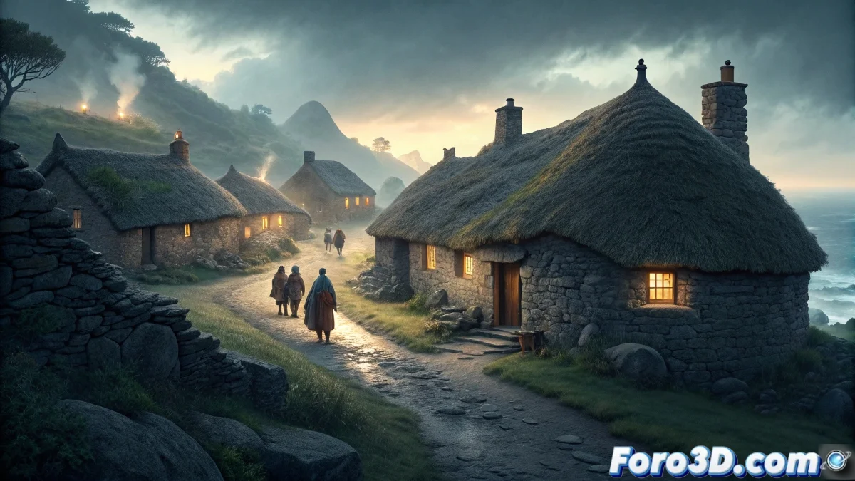 Crea el pueblo mediante diferencia y unión de formas geométricas básicas. Modela cabañas circulares usando cilindros escalados con transformaciones de redondeo para simular construcción con piedra y barro. Genera techos cónicos mediante la extrusión lineal de polígonos regulares con reducción progresiva. Implementa un sistema de caminos sinuosos usando extrusiones de spline simple entre puntos de control distribuidos aleatoriamente. Para representar la ausencia de nombres, incorpora espacios vacíos estratégicos donde normalmente irían carteles o identificadores, creando una sensación visual de misterio e incompletud.