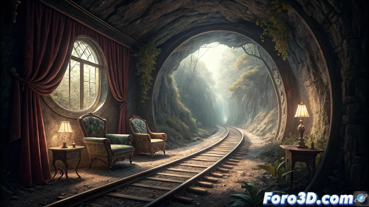 Para crear esta escena sobrenatural en Pencil 2D, comenzamos estableciendo dos espacios visuales contrastantes que coexisten a través del portal circular. Primero dibuja el túnel ferroviario abandonado usando líneas orgánicas y texturas rugosas para las paredes de roca, aplicando una paleta de grises terrosos y sombras profundas que transmitan abandono. La ventana circular debe ubicarse en el centro exacto de la composición, actuando como punto focal donde convergen ambas realidades.