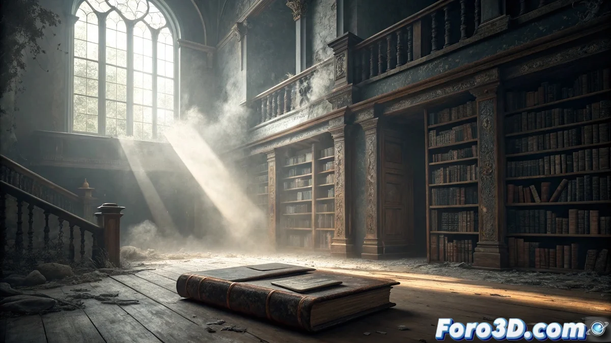 Configura un sistema de iluminación ambiental tenue que simule la luz natural filtrándose a través de ventanas sucias. Añade fuentes de luz direccionales con intensidad baja para crear zonas de penumbra y realce dramático sobre el libro. Aplica materiales con texturas de madera envejecida a los estantes utilizando mapas de rugosidad para simular el desgaste por el tiempo. Para el libro, asigna un material de cuero desgastado con reflejos sutiles y variaciones de color que sugieran antigüedad. El polvo y la suciedad se simulan mediante texturas de transparencia graduales en superficies horizontales.
