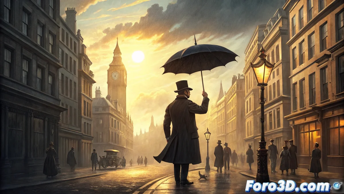 En la página Fusion, construye la escena principal utilizando planos superpuestos. Crea un fondo con calles londinenses mediante el nodo Background y aplica texturas de edificios victorianos. Para el vendedor, utiliza un plano de actor con ropa moderna pero discreta, aplicando máscaras rotoscópicas para aislarlo del fondo. El paraguas negro antiguo puede generarse mediante modelos 3D básicos o footage real, aplicando un nodo Transform para posicionarlo correctamente en la mano del personaje.