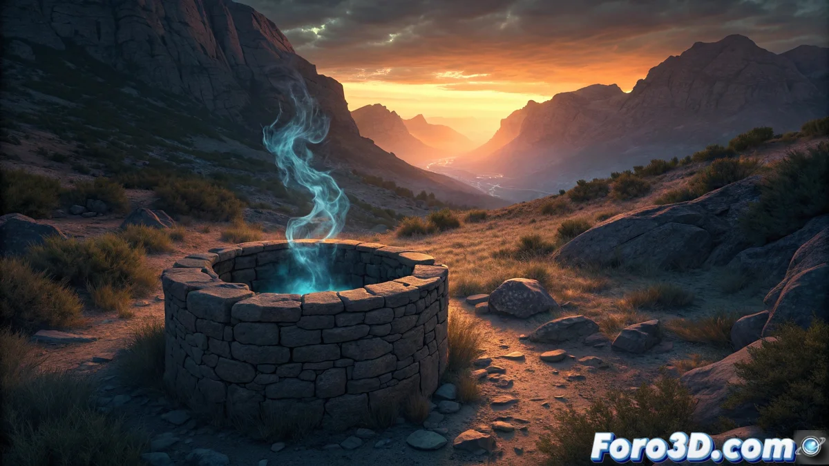 Para el efecto sobrenatural, añade una nueva capa en modo trama con transparencia activada. Utiliza el pincel de aire con color azul pálido para crear un tenue vapor emergiendo del pozo. En una capa separada en modo brillar suavemente, pinta un leve resplandor fantasmagórico en la abertura. Finalmente, aplica el filtro de desenfoque gaussiano a las montañas del fondo para crear profundidad atmosférica. Exporta el trabajo final en formato PNG preservando todas las capas para posibles ajustes.