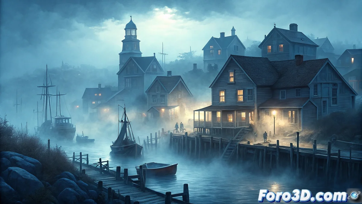 Configura la iluminación con un ciclo día-noche que muestre la niebla apareciendo en momentos específicos. Utiliza luz direccional con tonos azulados y grisáceos para simular la luz difusa a través de la niebla marina. Desarrolla shaders personalizados para los materiales del agua y la niebla, incorporando propiedades de dispersión de luz que creen el efecto etéreo característico. Aplica mapas de normales con movimiento suave al agua para simular olas tranquilas.