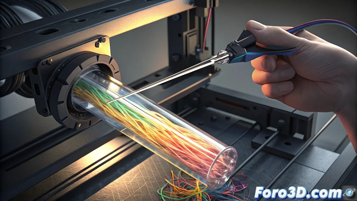 Desmonta con suavidad la sección del tubo que está obstruida. Puedes usar unos alicates de punta fina para extraer los trozos de filamento atascados. Si el filamento está muy adherido, aplicar calor leve con un secador de pelo a distancia puede ablandarlo y facilitar que lo saques. Asegúrate de que el conducto queda completamente libre de cualquier resto antes de volver a montarlo.